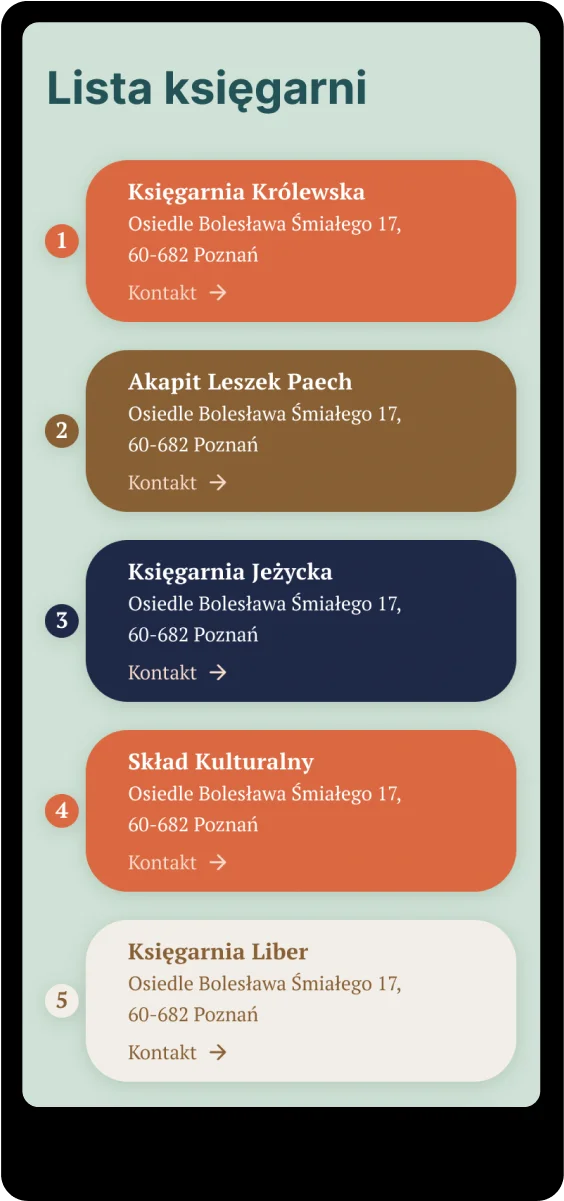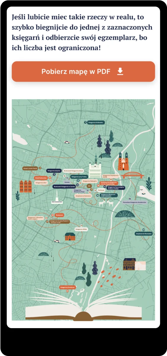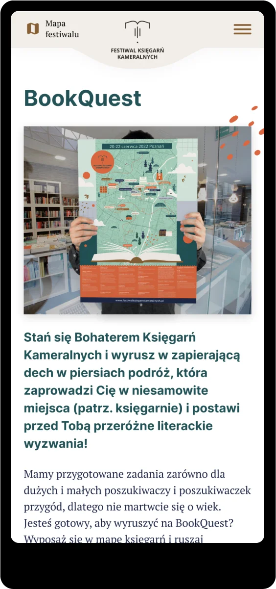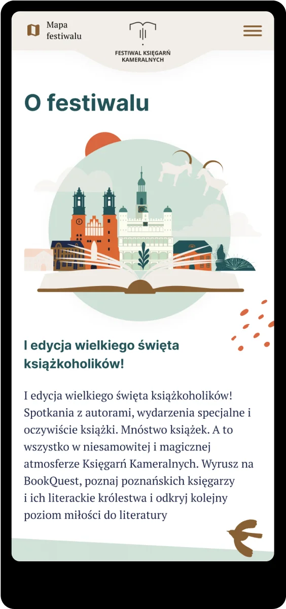 Strona internetowa dla poznańskiego festiwalu księgarń została wdrożona w builderze Elementor PRO. Jej głównym wymaganiem była łatwość wyszukania zbliżających się wydarzeń wraz z mapą Poznania, na którą zostały naniesione księgarnie biorące udział w tym wydarzeniu.