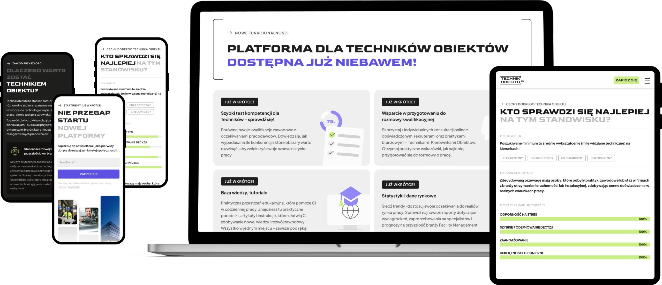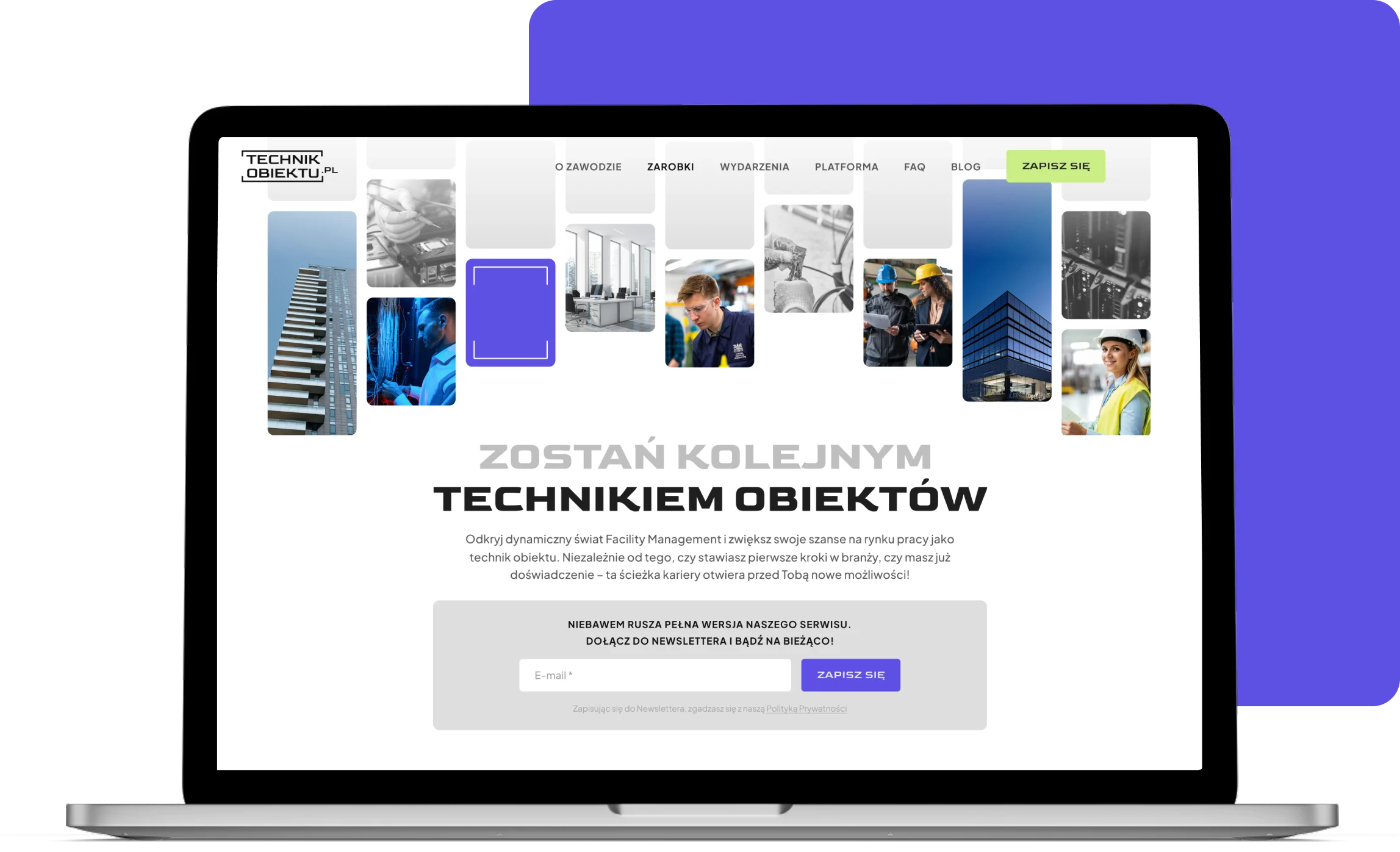 Projekt rozpoczęliśmy od stworzenia strony startowej typu MVP, która prezentuje najważniejsze założenia i funkcjonalności przyszłej platformy. Choć pełna wersja serwisu jest jeszcze w przygotowaniu, celem było zbudowanie landing page’a, który już teraz dostarcza wartości użytkownikowi. Postawiliśmy na sekcje poświęcone zarobkom w branży, aktualnościom rynkowym oraz wydarzeniom edukacyjnym, by zwiększyć zaangażowanie i zachęcić użytkowników do zapisu do newslettera.